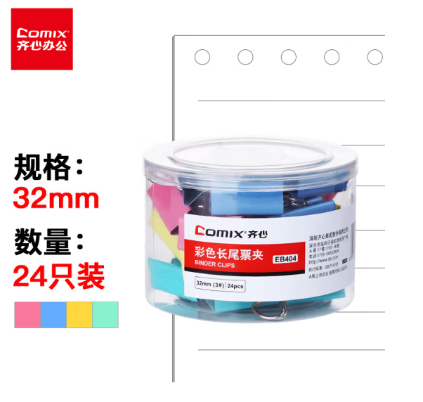 齐心(COMIX) EB404 长尾夹/燕尾夹/票夹 彩色金属 32mm 24只/筒 办公文具工具